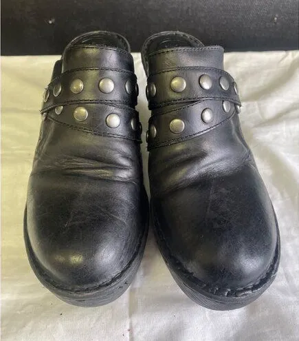 Born Women's Black Leather Mules/ Shoes/ Slide on Chunky Heel 3.75 heel Size 9 SKU 2862 These shoes have a strap across with silver metal studs the front heel is 1' and the heel itself is 3.75 This item has been cleaned, sanitized and deodorized Features: • slide heel mules Size: Womens 9 Condition: Pre-Owned Good