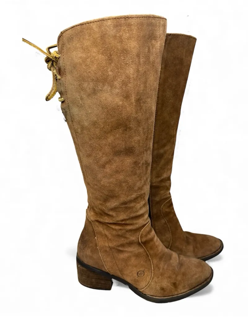 Distressed suede leather uppers with a round toe. Knee-high boot silhouette, Adjustable laces at top-of-shaft for a comfortable fit. Full-length medial side zipper closure, Soft and breathable leather linings, Fully cushioned footbed for added comfort, Opanka hand-sewn construction creates a long-lasting and flexible bond, Embedded steel shank provides added stability and support, Durable rubber outsole. Heel height approx. 2", Boot shaft height approx. 14 3/4", Boot shaft circumference approx. 15" Boot does show some unintentional distressing in the form light discolorations across the upper and around the back toes. No structural flaws. Please see all pix for full scope of wear. Tags: leather, corduroy, plaid, boho, country, fall, autumn, outdoor, classic, preppy, quality, zip, equestrian, comfortable, distressed, cottagecore, prairiecore, crunchy, suede, festival, closet staple,