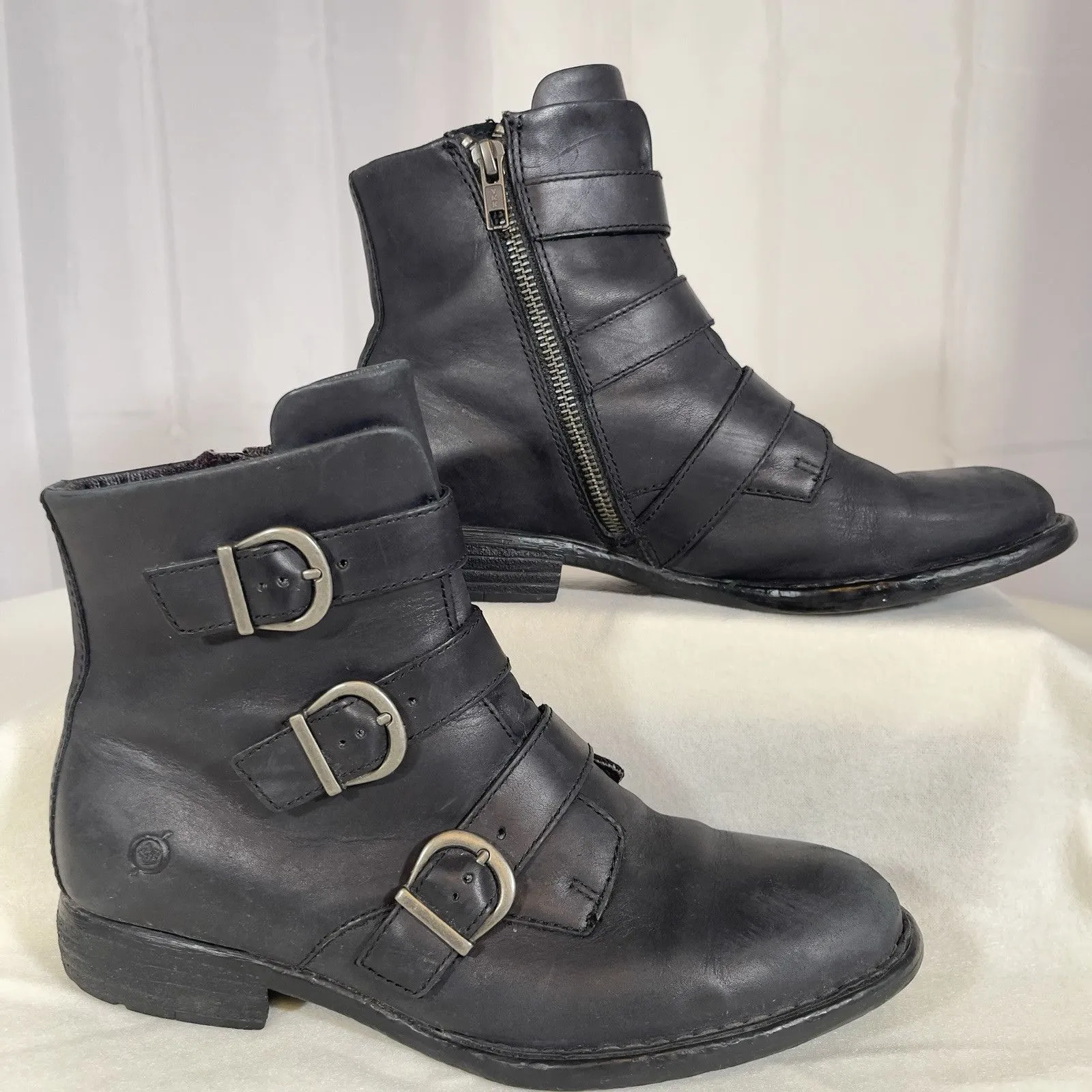 Excellent condition. Preowned womens Born Boot size 8 with buckle accents and a side zipper for easy access. Black leather upper and a synthetic sole with a low heel. Items typically ship within 24 hours of payment. Returns accepted within 30 days. Please do not remove tags from new items prior to fitting. Any NWT items returned without tags attached will be subject to a partial refund.