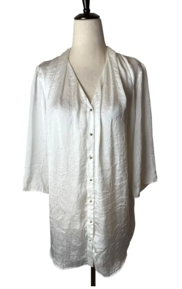 This white blouse features a lightweight, breathable fabric and a sophisticated draped neckline. Its button-down design and 3/4 sleeves add a polished touch. Features: • Crinkled Satin Fabric • Pleated Details At The Shoulders • V-Neckline • Rare Button Front • Pleated Back Yoke • spring, fall, winter, summer • solid • dry clean Measurements: armpit to armpit 20 in / 51 cm length 31 in / 79 cm sleeve 16 in / 41 cm Great Pre-Owned Condition. (see pics for details) Flaw: The material and size tag are missing so please refer to measurements for sizing. All offers welcomed! ❤️ Professional seller, smoke free home and same or next day shipping. Like items for price drops. Receive the 30% off bundle discount when you purchase two or more items. designer, luxury, satin, silky, crinkled, preppy, old money, country club, quiet luxury, corpcore, Career, office, work, professional, mature, sophisticated, business, careerwear, academia, businesscore, Designer, Casual, Loungewear, Every Day, Lunch, Layer, Feminine, Winter, Spring, Fall, Summer, Classic, Chores, Sunday, Professional, Business, Office, Workwear, Classy, Elegant, Modest, Brunch, Dinner, Modesty, Romantic, Pretty, Career, Corporate, Corporate Casual, Smart Casual, Preppy, Bohemian, Boho, Folk, Loose, Wmns
