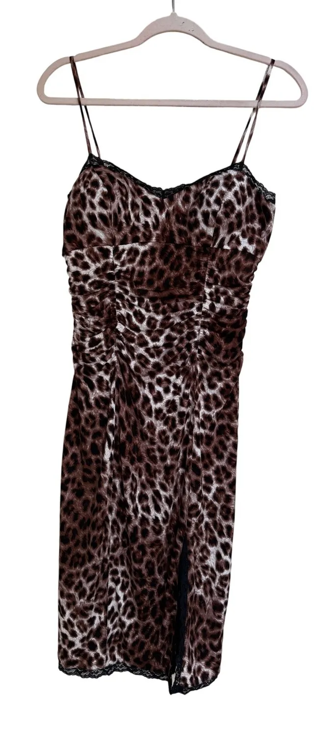 New with tags. Boston Proper Animal Lace Slip Dress Ruched Strappy Midi Brown Black Size 6. Chest:... Show more