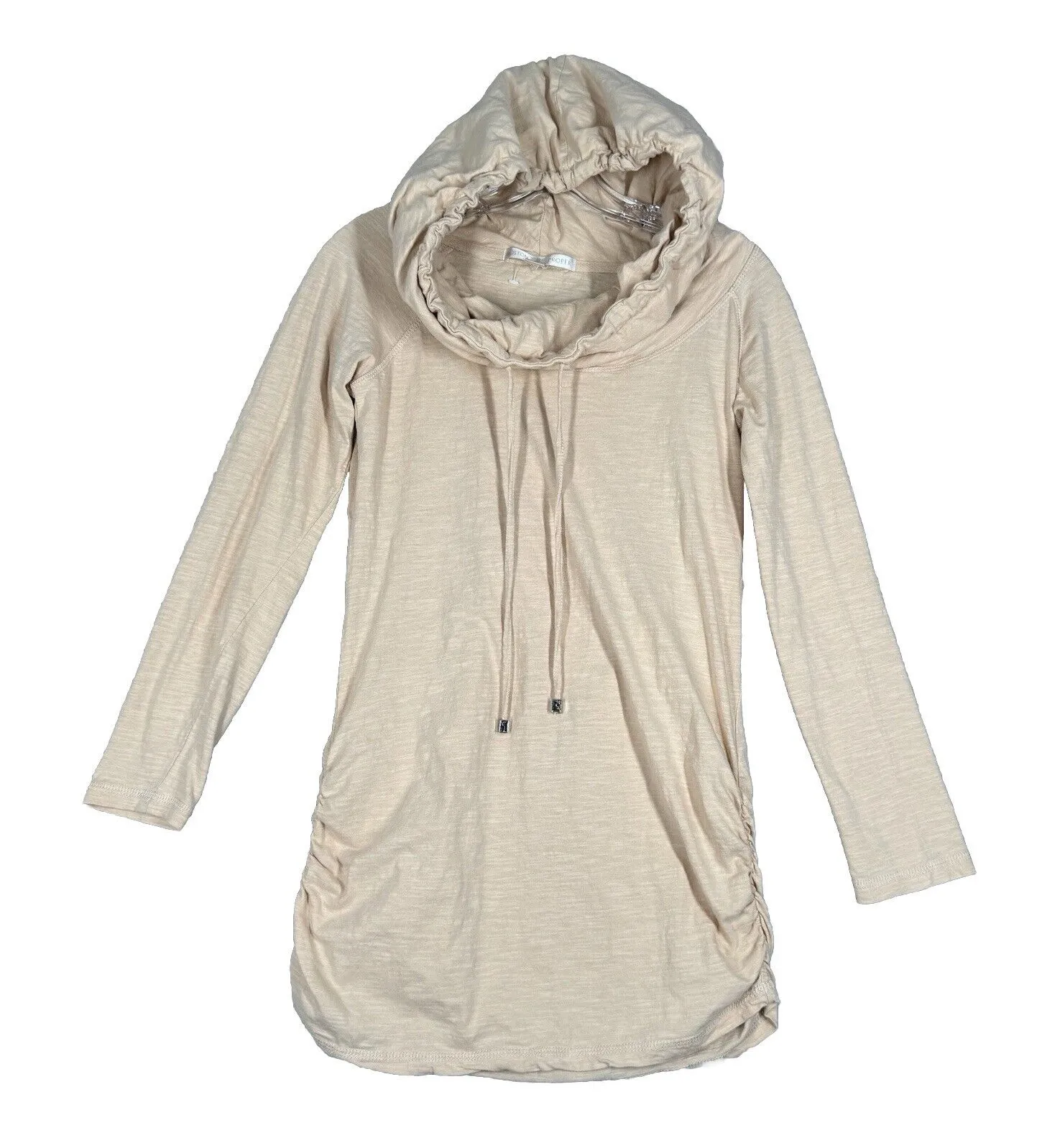 Boston Proper Shirt Womens Small Cream Jersey Knit Hoodie Casual Athleisure Women's Size Small Long Sleeve Round Neck Ruched Sides Lightweight Pullover Style 100% Cotton Stretch Lounge Workout Gym Everyday Basic Easy Wear On the Go Measurements are Approximate: Length 27" Armpit to Armpit 17" Gently Used Condition. No Rips Tears or Stains (1805)