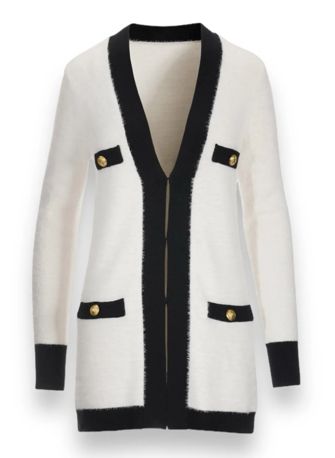 Boston Proper cardigan White and black colorblock Gold button detail Deep V neck Long sleeve Soft fuzzy knit texture Hook closure Chest pocket accents Size XS Nylon acrylic cotton blend Flat lay measurements 18 inches pit to pit 28 inch length Classic preppy look Work to weekend layering