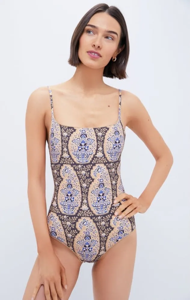 One-piece, pull on style Square neckline with a very slight scoop Spaghetti straps with antique gol... Show more