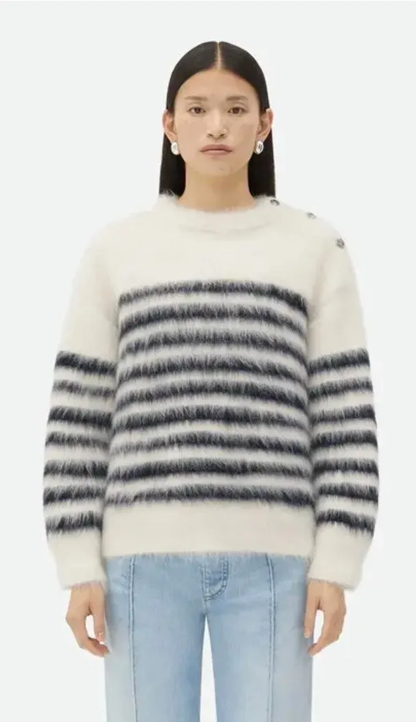 XS Chalk/Navy In great pre-owned condition. Size XS. Retail: $2,550.00. This Bottega Veneta Mariniere mohair sweater delivers that signature elevated, quiet-luxury aesthetic with its ultra-soft, heavy-gauge wool-mohair blend and modern nautical stripe design. Crafted in a relaxed, slightly oversized silhouette, it features polished shoulder buttons, refined ribbed trim, and an effortless pullover style. The Chalk and Navy color pairing makes this a versatile statement knit that transitions seamlessly from casual daytime layering to chic evening styling. High-quality construction and premium fibers add warmth, texture, and timeless designer appeal. A perfect elevated staple for fall and winter wardrobes. Keywords: luxury sweater, designer knit, mariniere stripe, mohair blend, Bottega Veneta pullover, quiet luxury, elevated essentials, winter layering piece. When Laying Flat: Bust Measures Approximately 21", Length 20.2" (Please note: All measurements were taken by hand and are approximate; slight variations may occur.). B1-31 No trades. No modeling.