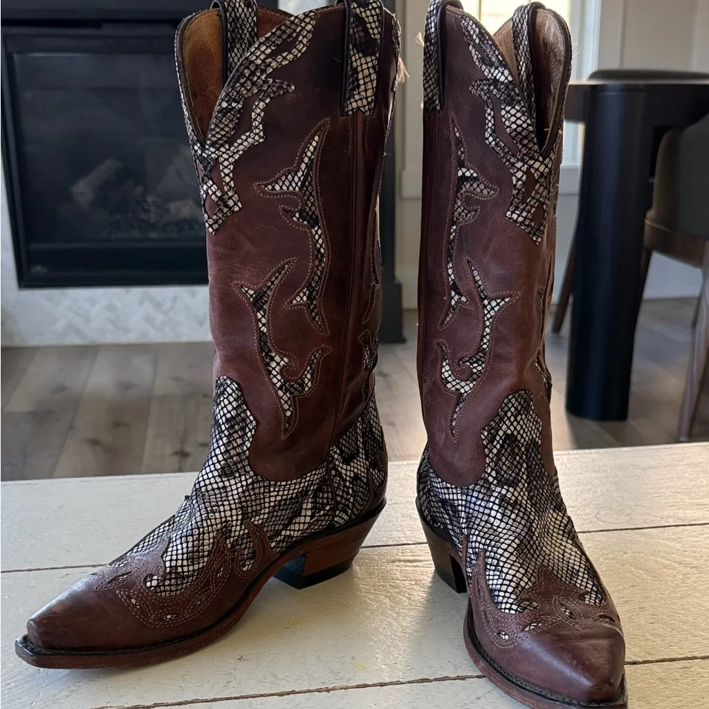 EUC- no wear to note. - Classic faux rattlesnake skin tops - Dark brown leather - Snip toe - Perfect for dancing!! - Made in Canada - 2" heel - 12.5" shaft height- pull on styling. - 5 x 4.5" boot opening.