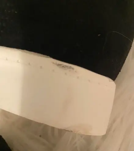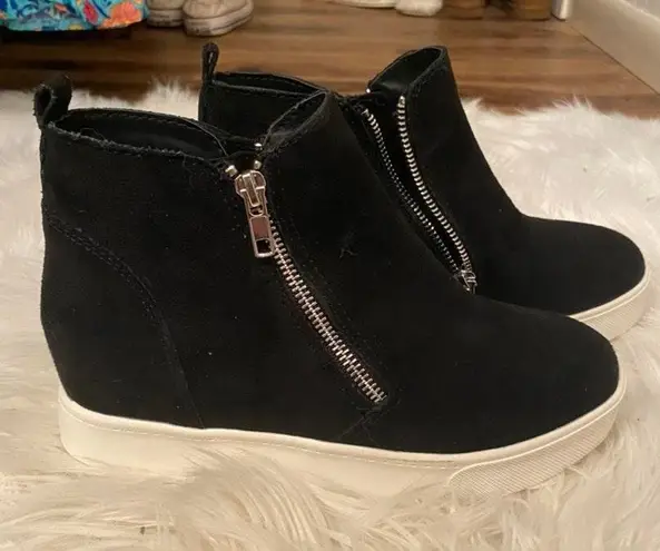 Black suede sneaker with hidden wedge, silver zippers on sides. Inner zipper is functional, outer zipper is just for looks. Never worn except for around the house. Some scuffs on soles. Other than that, they’re perfect!