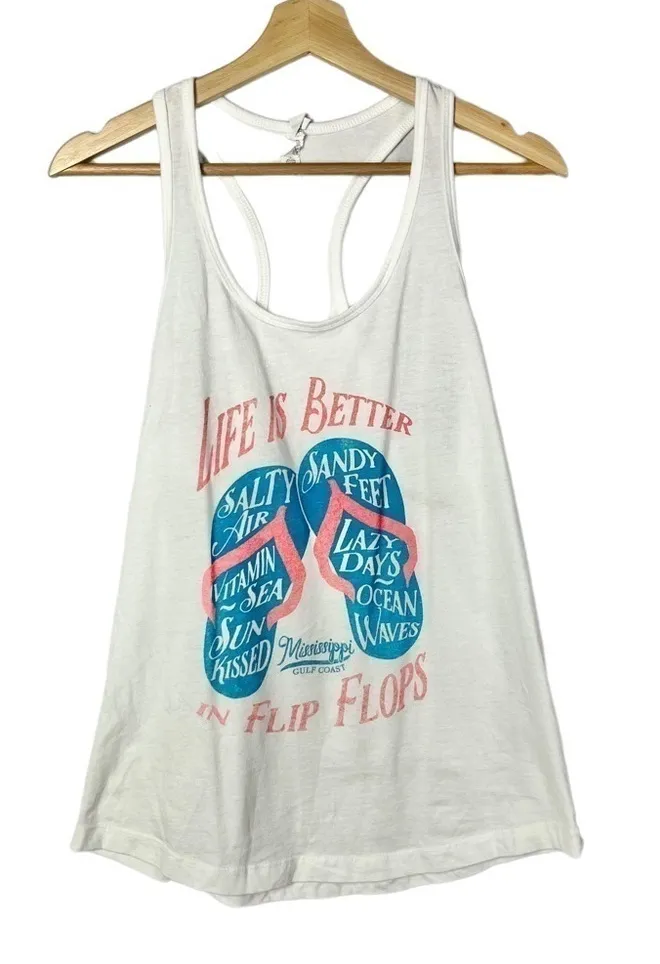 Boutique Life is Better Mississippi Tourist Tank Top Very good used condition, minimal signs of wear. - Flip flop graphic - Scoop neckline - White body & backing - Life is better in flip flops - Racerback detailing - Lightweight fabric - 60% cotton 40% polyester Measurements: - Bust 16.5 - Length 25.5 All items come from a smoke & pet free environment and ship same or next business day.