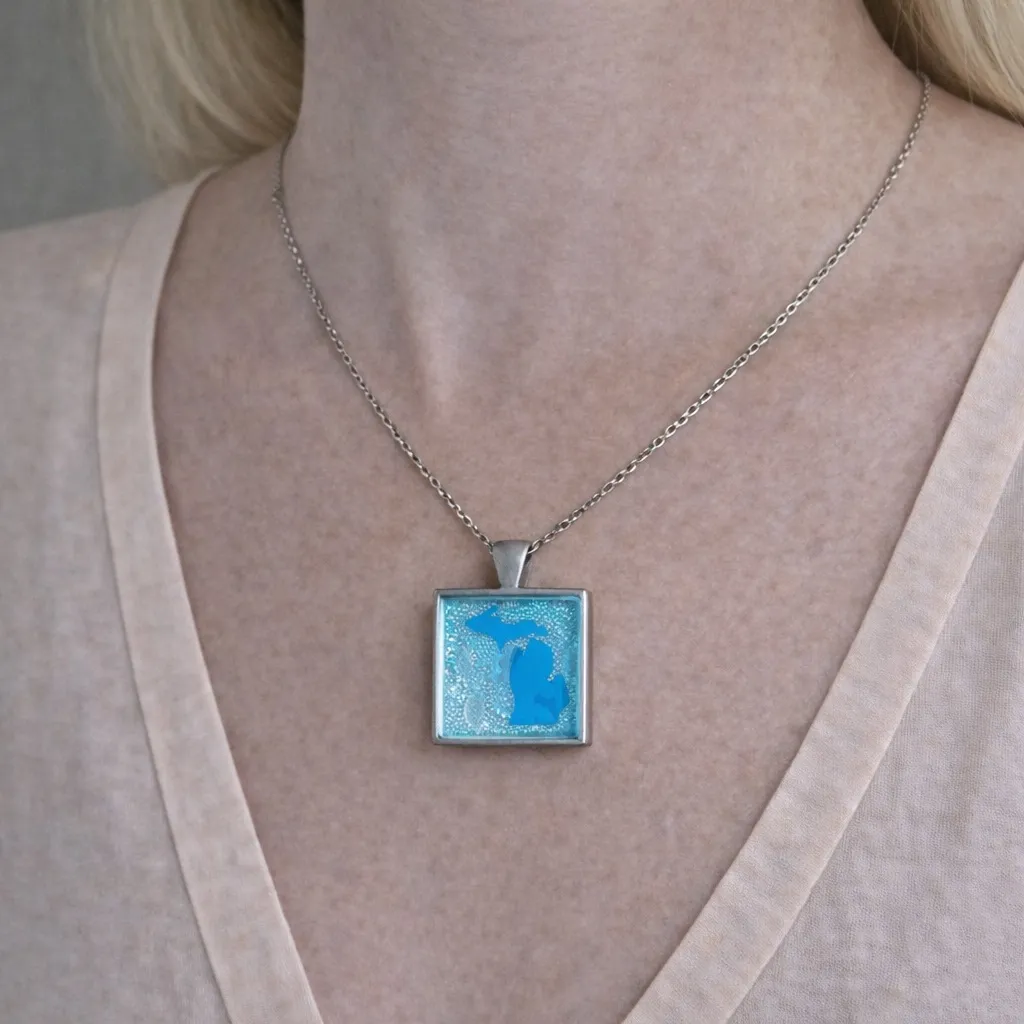 | Great Lakes Jewelry ⸻ Description Unique Michigan state pendant necklace featuring a square gla... Show more