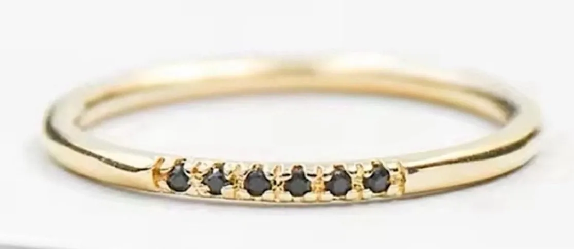 Sizes 5.5-8 Available in separate listings Gleaming accent for your fingers, this delicate 14k gold plated sterling silver ring features a row of striking black stones, adding a touch of edgy elegance to any look. The minimalist design ensures it's versatile enough to wear alone for a subtle statement or stacked with other rings for a bolder, personalized style. Its slender band offers comfortable wear, making it an ideal everyday piece that effortlessly elevates your ensemble. Perfect for adding a hint of sophistication to your office attire, a night out with friends, or even a casual weekend brunch. Type: Ring Metal: 14k Gold Plated Color: Gold Main Stone Color: Black Number of Gemstones: 5 Main Stone: Onyx Shape: Round Style: Band, Minimalist Material: Metal, Stone Main Stone Shape: Round Setting Style: Channel-Set Cut Grade: Good Keywords: gold ring, black stone ring, stackable ring, minimalist ring, dainty ring, gold band ring, women's ring, fashion jewelry, statement ring, gift for her, black diamond ring, thin gold ring, everyday ring, party ring, wedding band