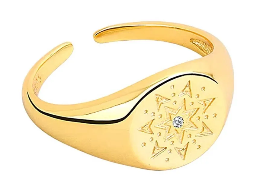Add a touch of elegance to your jewelry collection with our stunning NEW Unisex Gold-Plated Diamond Sun Signet Adjustable Ring. Crafted from high-quality .925 sterling silver, this ring features a radiant gold-plated finish and intricate pave diamond accents that sparkle in the light. The adjustable design allows for a perfect fit on any finger, making it a versatile addition to your wardrobe. - Luxurious gold-plated finish - Sparkling pave diamond accents - Adjustable design for a perfect fit Upgrade your everyday look or add the finishing touch to your evening attire with this eye-catching ring. Its unique sun signet design is both timeless and on-trend, making it the perfect statement piece for any occasion. Invest in quality and style with our Women's Gold-Plated Diamond Sun Signet Adjustable Ring. #GoldJewelry #DiamondAccents #AdjustableRing #FashionStatement