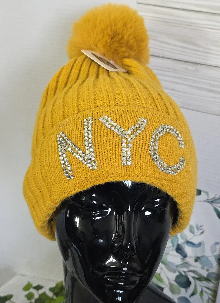 Pom pom knit hat with fuzzy inside Chunky ribbed style Golden yellow in color NYC on front Super cute Super warm One size New knit hat winter fall ribbed yellow pompom NYC bling casual dressy everyday simple warm