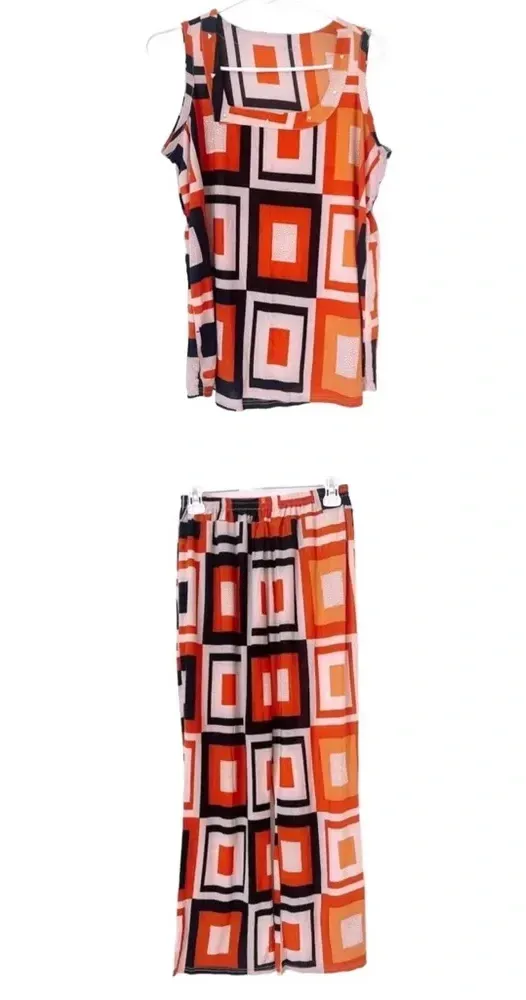 2 piece Pajama Set Sleeveless Tank Top & Pants Set Retro Mod Geometric Matching Comfy Soft slinky stretchy. Size XL. So cute it can be worn as Day wear loungewear also. No Tags. Material is soft & stretchy. Lightweight. Pullover top with Symmetrical neckline & silver embellishments. Pull-on elastic waist pants with ankle slits & 2 back pockets. Can be worn separately or as a set. (Good condition but Please NOTE: the top has a few very minor snags in front & back & a spot on the neckline. The pants have a couple of tiny spots in the fabric in front. See last 5 photos). Top: bust 19.25” across unstretched. Length 26.5” from shoulder. Pants: Waist 11-18” across, inseam 26”. Bin5
