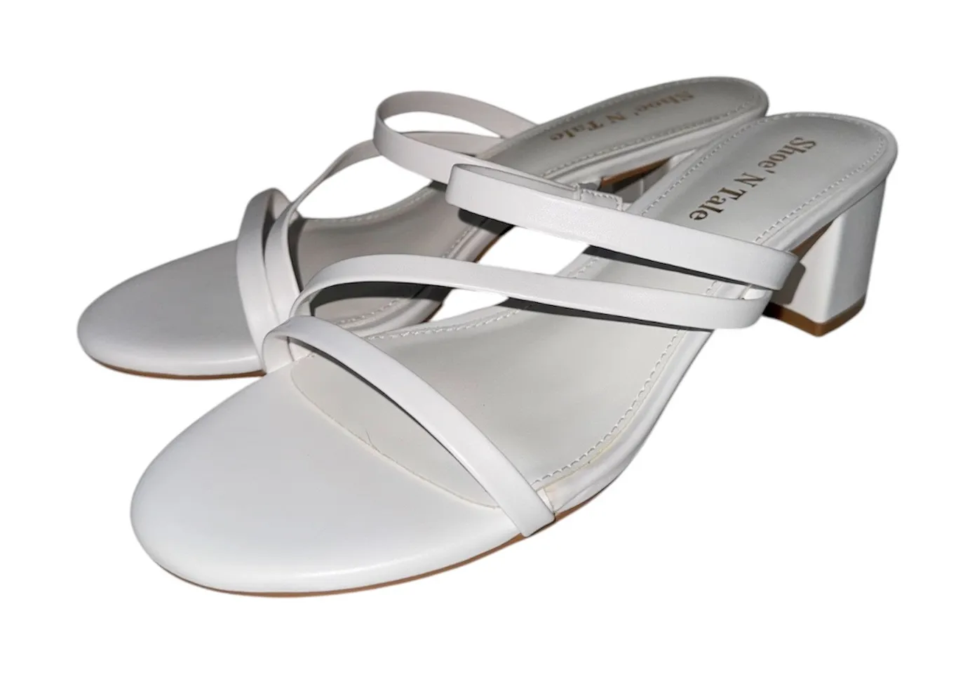 Brand new Shoe’N Tale white strappy open toe chunky block heel sandals. New in box & in perfect condition! Rounded open toes. Strappy detail. Slip-on style. 2” chunky block heel. Solid white color. Size 8. Man made materials Original box included