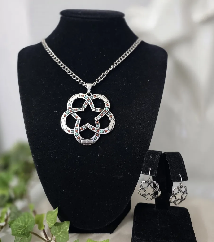 Beautiful pendant necklace and earrings set Silver tone horseshoe star pendant with turquoise blue and red accents Chain measures 18" plus 3" chain extender Matching hook style earrings Pretty cowboy set @101 silver horseshoe paniolo star casual dressy work office simple classic timeless style everyday cowgirl western