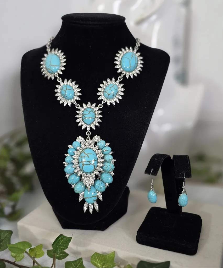 Beautiful statement necklace and earrings set Silver tone chain with turquoise blue howlite stone and rhinestones Measures 20" plus 3" chain extender Small turquoise howlite stone drop earrings hook style Super pretty set @G glam gala turquoise stone howlite casual dressy everyday classic timeless