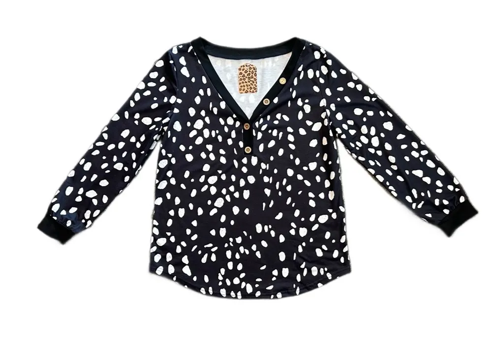 Boutique Talia style blouse Long sleeve black top with white polka dots of various shapes. The white dots have smaller black dots on them Black cuffs V-neck with faux wood buttons Size large Approximate lay flat measurements: Pit to pit 21 inches Shoulder to hem 28 inches Sleeve length 24 inches New with tags but has some fading to black background shown in close ups Material: 95% polyester 5% spandex