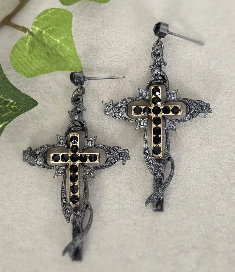 Beautiful Ornate statement earrings Gunmetal silver tone with gold tone Cross with inner cross design Maracasites style and black glass stones Post style Super pretty cross earrings @eb gunmetal silver gold cross in cross Ornate punk gothic unique casual dressy glam