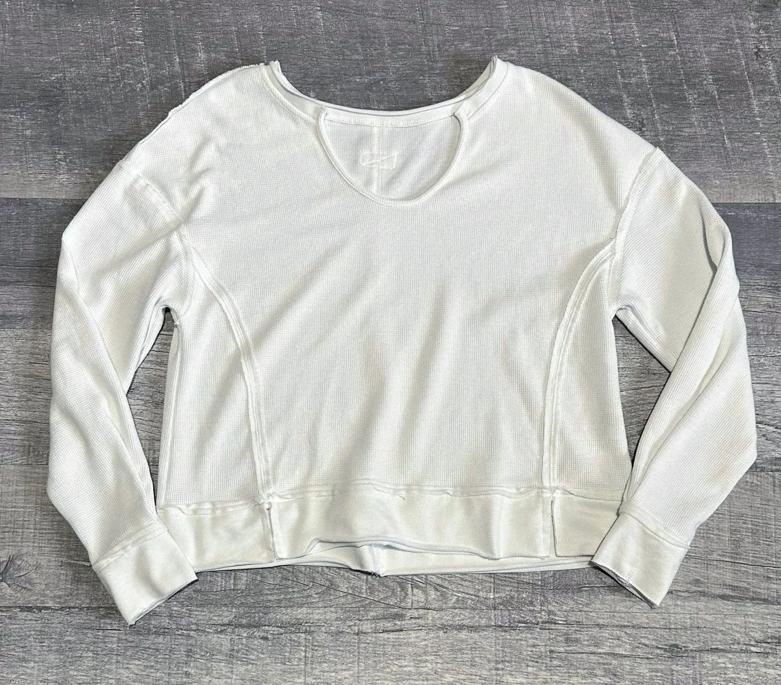 Boutique Womens Round Neck White Waffle Knit Long Sleeve Top 35% Cotton / 60% Polyester / 5% Elastane Drop Shoulder Exposed Seam Slight Crop Length Notch Neckline Relaxed Fit SIZE: Womens Small Approximate Measurements Lying Flat: Chest 19.5” Length 21.5” Sleeve (Upper) 8” / (Lower) 19” PRE-OWNED: Good condition. No holes, stains or visible flaws. Some light wear can be expected due to previously being worn & washed. Refer to photos. FC-11-00