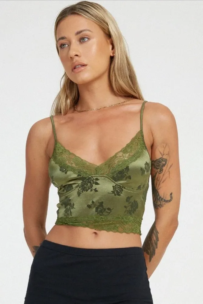 Boutique Women’s L Lace Trim Satin Camisole Tank Olive Green Y2K Style Cropped Size L- tag was cut... Show more