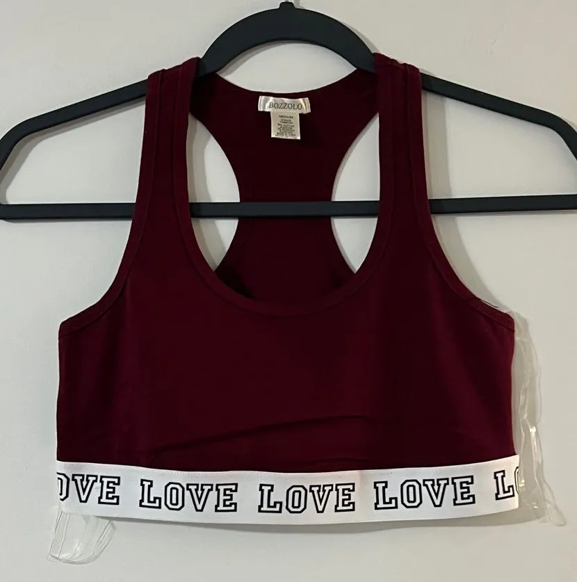 Stylish maroon sports bra with a bold 'Love' band. Ideal for workouts or casual wear.