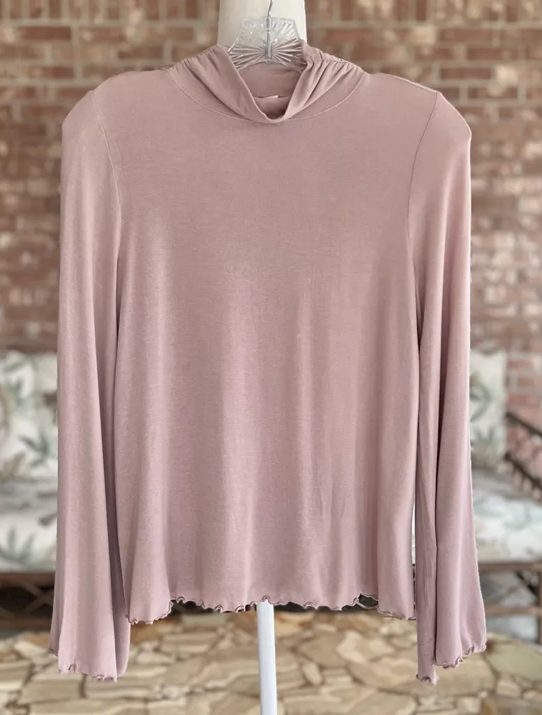 Lettuce edging at hemline and flared sleeves ~ stretchy and lightweight knit ~ flared sleeves at... Show more