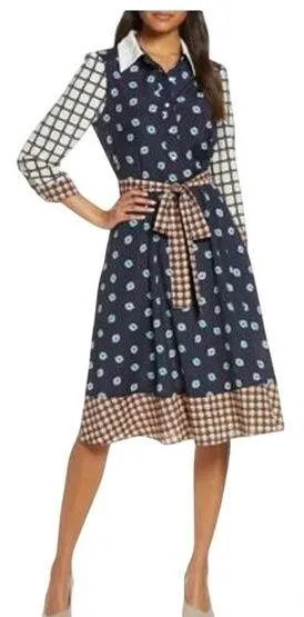 NWT Eliza J Geo Print Belted Shirtdress Collar Midi Button Closure A mix of bold geometric prints stands out on this fun shirtdress cut with a spread collar, buttons down the front, and three-quarter sleeves. A contrast print belt can be tied at the waist to enhance the flattering silhouette. 43" length Front button closure Spread collar Three-quarter sleeves with button cuffs Side-seam pockets Removable sash Partially lined 100% polyester Dry clean or hand wash, line dry Excellent Condition, Smoke Free Environment, Ships Next Business Day! Ask any question! Bundle & Save!