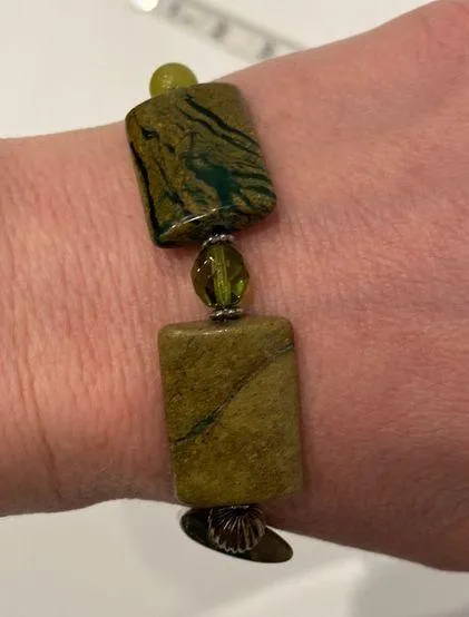 Unbranded women’s bracelet with neutral multicolored colored rectangular gemstones with alternating yellow-green & metallic beads between. Silver-tone toggle clasp. ⭐️ EUC ⭐️ One size ⭐️ Measurements in pictures ⚡️⚡️ fast shipping!!⚡️⚡️ Bracelet women’s beaded gemstones neutral boho bohemian