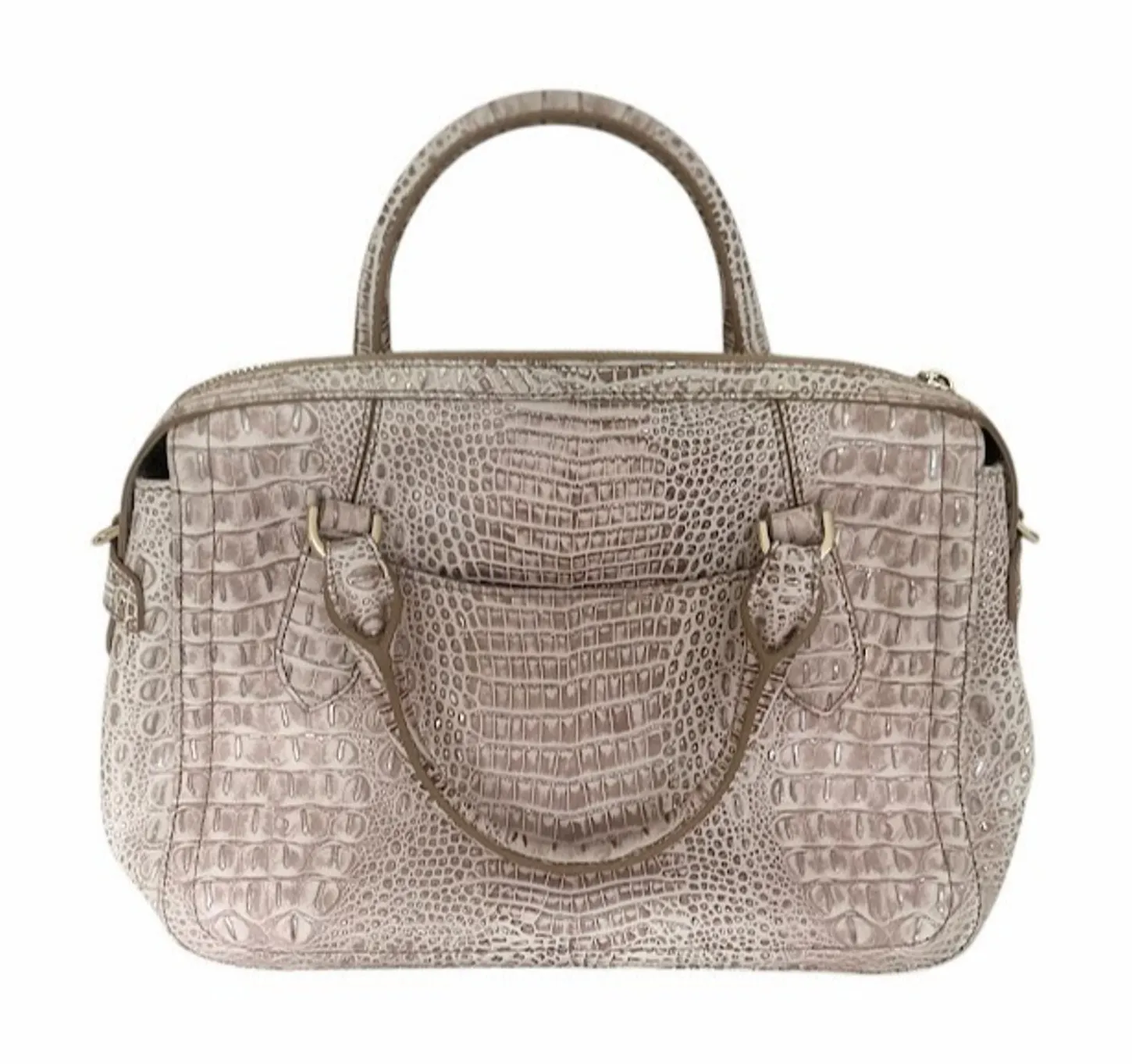 Brahmin Finley Carryall Satchel Bag Large Croc Embossed Leather Purse Color: is a taupe/tan w/ cream/white Bag approximately 13" x 6" x 9", handle drop 6" Color is a white rose pink Detachable strap ; full zip Very Good pre-owned condition; w/ no flaws noted Lighting and viewing screen could slightly effect the color. We do our best to ensure accuracy with photos. 011326