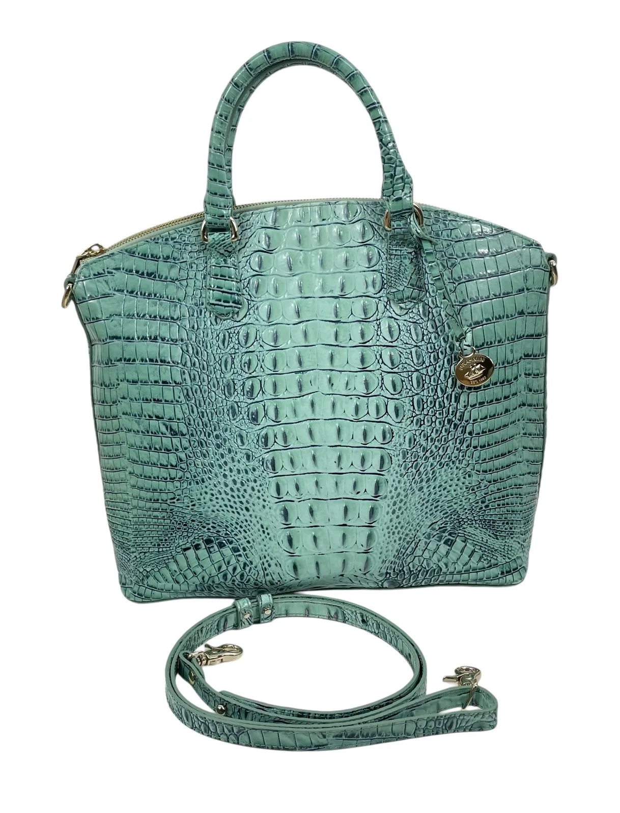 Brand: Brahmin Condition: Pre-owned - Gently used. Some wear on one corner. Very good condition overall Material: Leather Detail: Biscay Melbourne color ( blend of teal & navy blue color) Large zip top dome satchel Dual handle Removable shoulder strap Top zipper Gold hardware Back pocket Footed bottom Guarantee authentic Measurement: 14.2"L x12"H x 5"D 4" Handle drop 12" Strap drop