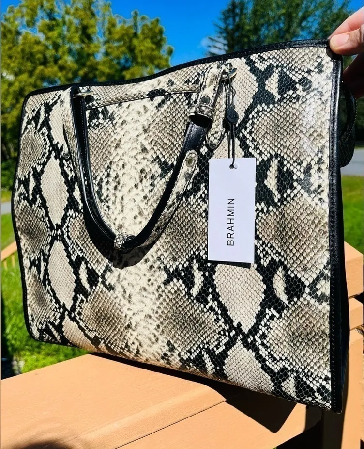 Brand new with tags Brahmin Tia large tote crafted in the Caviar Felix Melbourne croc-embossed leather. This sleek, structured tote features a bold black and ivory python-inspired pattern with polished Brahmin detailing, making it a standout everyday bag with ample interior space. Designed for both style and function, the Tia tote offers organized compartments, adjustable shoulder straps for a customizable fit, and a secure zip-top closure. Perfect for work, travel, or everyday wear. Details: • Brand: Brahmin • Style: Tia Tote • Condition: New With Tags • Color: Caviar Felix • Melbourne croc-embossed leather • Zip top closure • Structured tote silhouette • Adjustable shoulder straps • Polished hardware Interior Features: • Multiple organizational compartments Approximate Measurements: • Width: 14.25" • Height: 13" • Depth: 4.5" Includes original Brahmin hang tag. 100% authentic or your money back. #brahmin #brahminbag #tiatote #melbourneleather #designtote #luxuryhandbag #nwt #womenshandbags #worktote #everydaybag