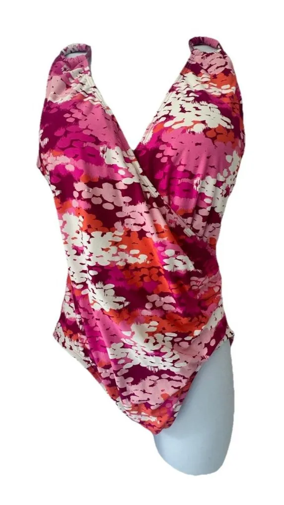 The product is a brand new Carmen Marc Valvo women's surplice-neck one-piece swimsuit in size 14. This multicolored swimsuit features a flattering surplice neck and fits in a regular size. Perfect for women looking for a stylish and comfortable swimwear option to wear at the beach or pool.