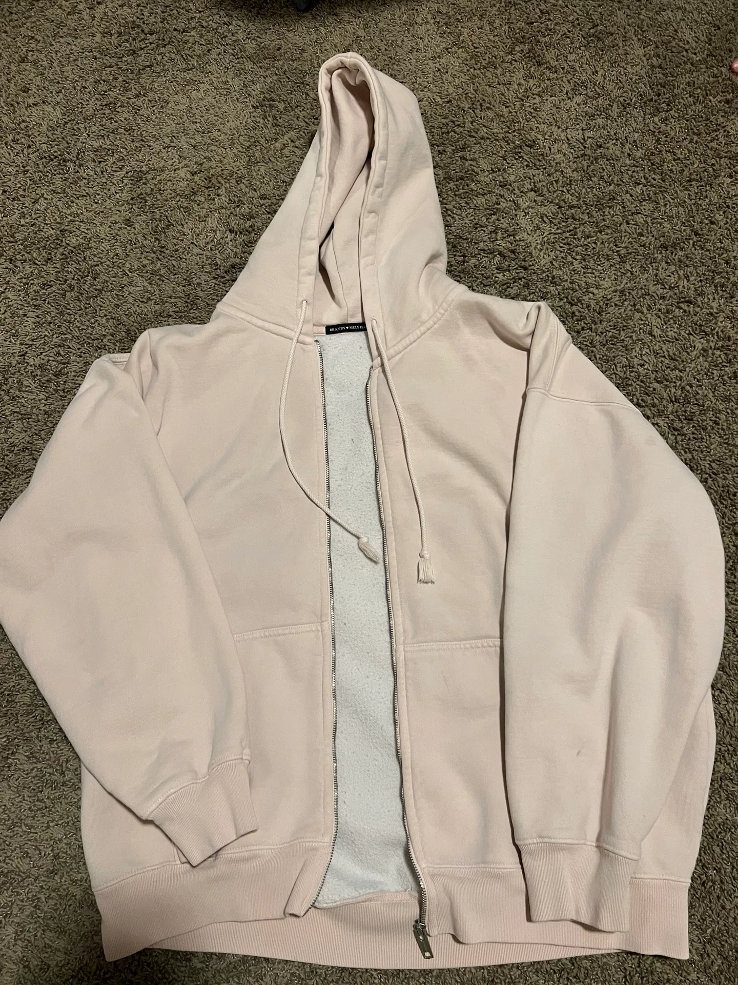 Light pink brandy zip-up Some stains but barely noticeable More pink in person