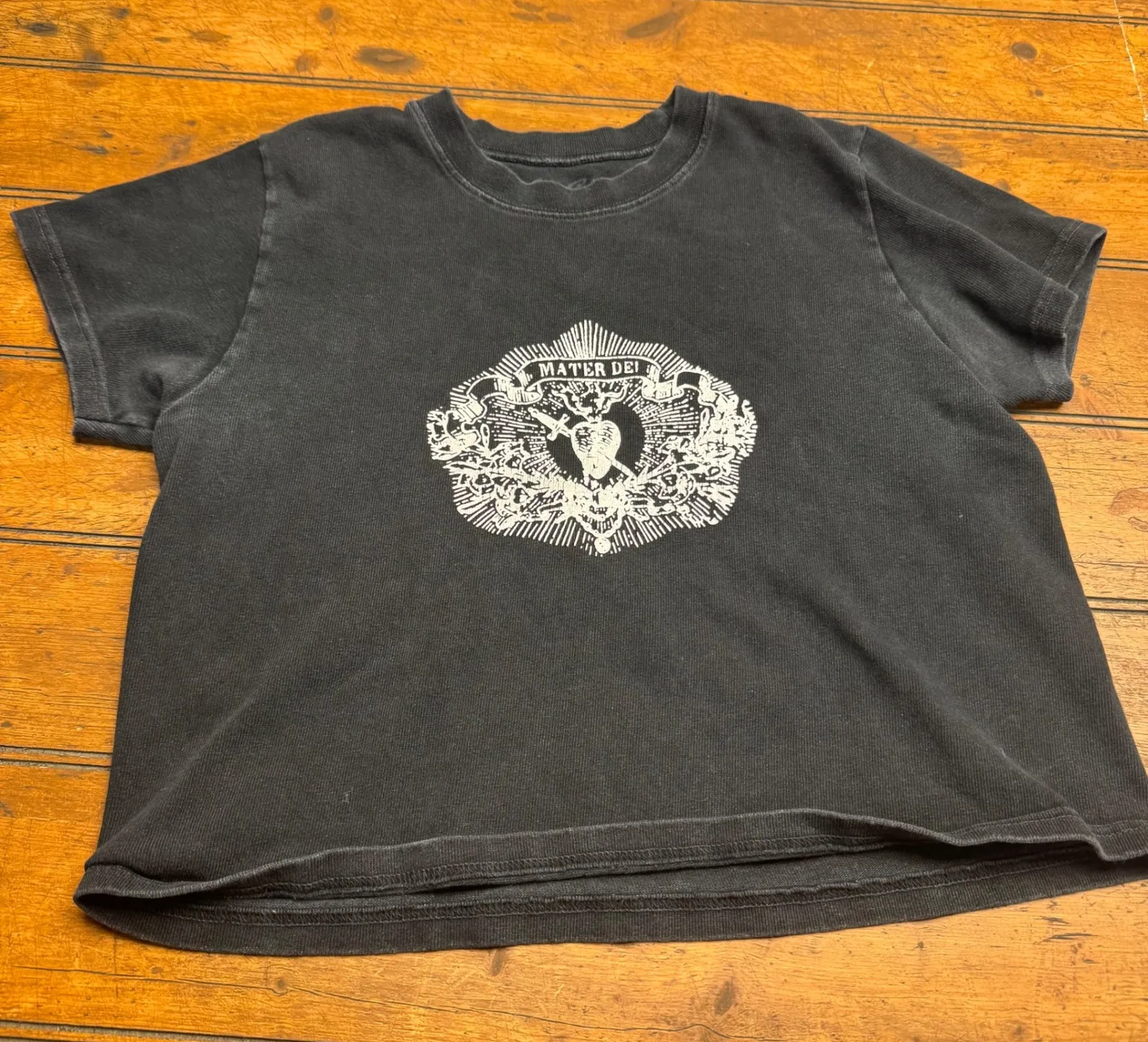 Brandy Melville graphic t-shirt with a Mater Dei emblem featuring a heart pierced by a sword. Short... Show more