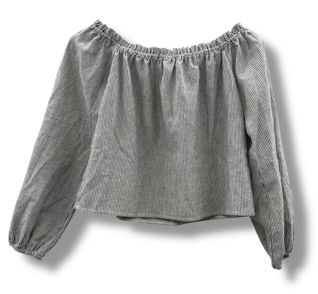 Designed with a flattering off-the-shoulder neckline and soft stretch fabric, this top gives off a laid-back yet feminine vibe that's perfect for warm days, layering, or weekend wear. The subtle gray and white stripe pattern adds a timeless, coastal-inspired touch.