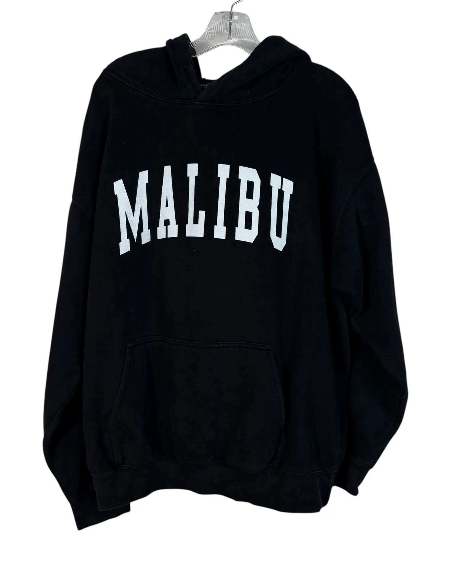 In good condition! Solid black hoodie with a white spellout logo the front. Oversized fit with a fle... Show more