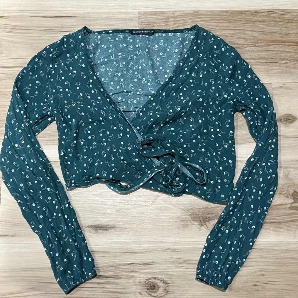 Brandy Melville Long Sleeve Floral Tie Front Crop Green Top Women’s Small Measurements- Pit to Pit:... Show more