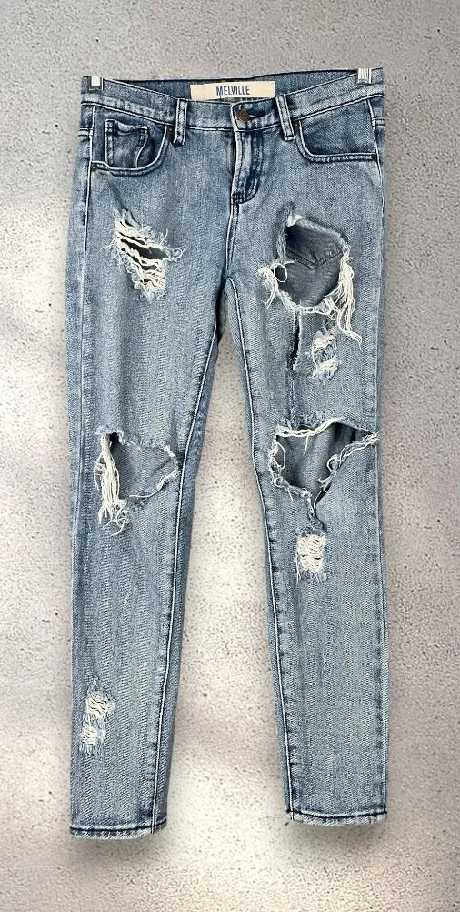 Effortless + edgy 💙 these Melville jeans feature a classic light wash with heavy distressing for th... Show more