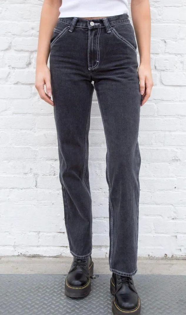 High-rise faded denim jeans with white stitching front and back pockets and a utility loop with a st... Show more