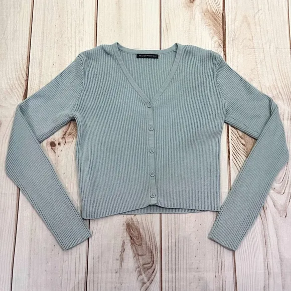 Brandy Melville pale baby blue cropped cardigan sweater. V neckline, front buttons, long sleeves, ri... Show more