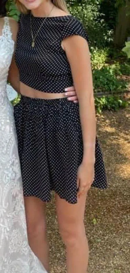 Brandy Melville set Black with polka dots Open back Crop top and flowy skirt No size but I would s... Show more