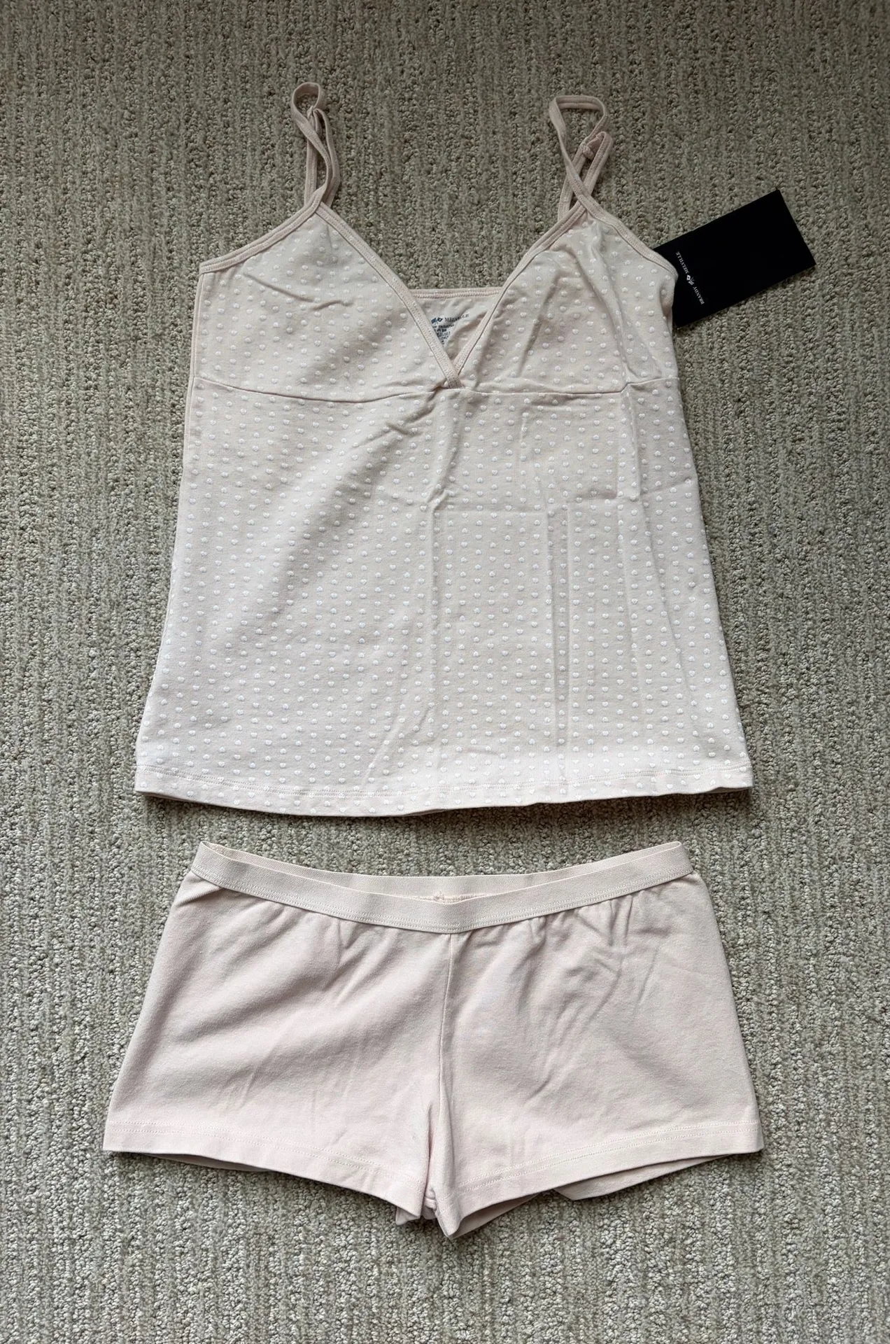 Super cute pajama set. Bottoms are plain pink top is pink with little white hearts. Comfortable fit.