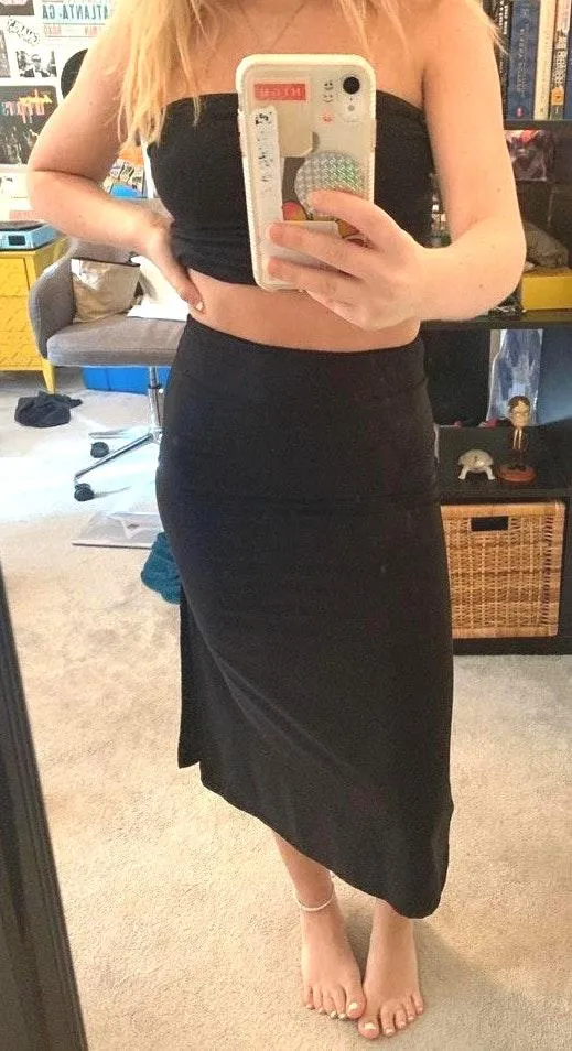 Silk material stretchy waist skirt that goes until mid legs with a slit on the side, super in style... Show more