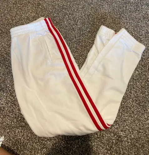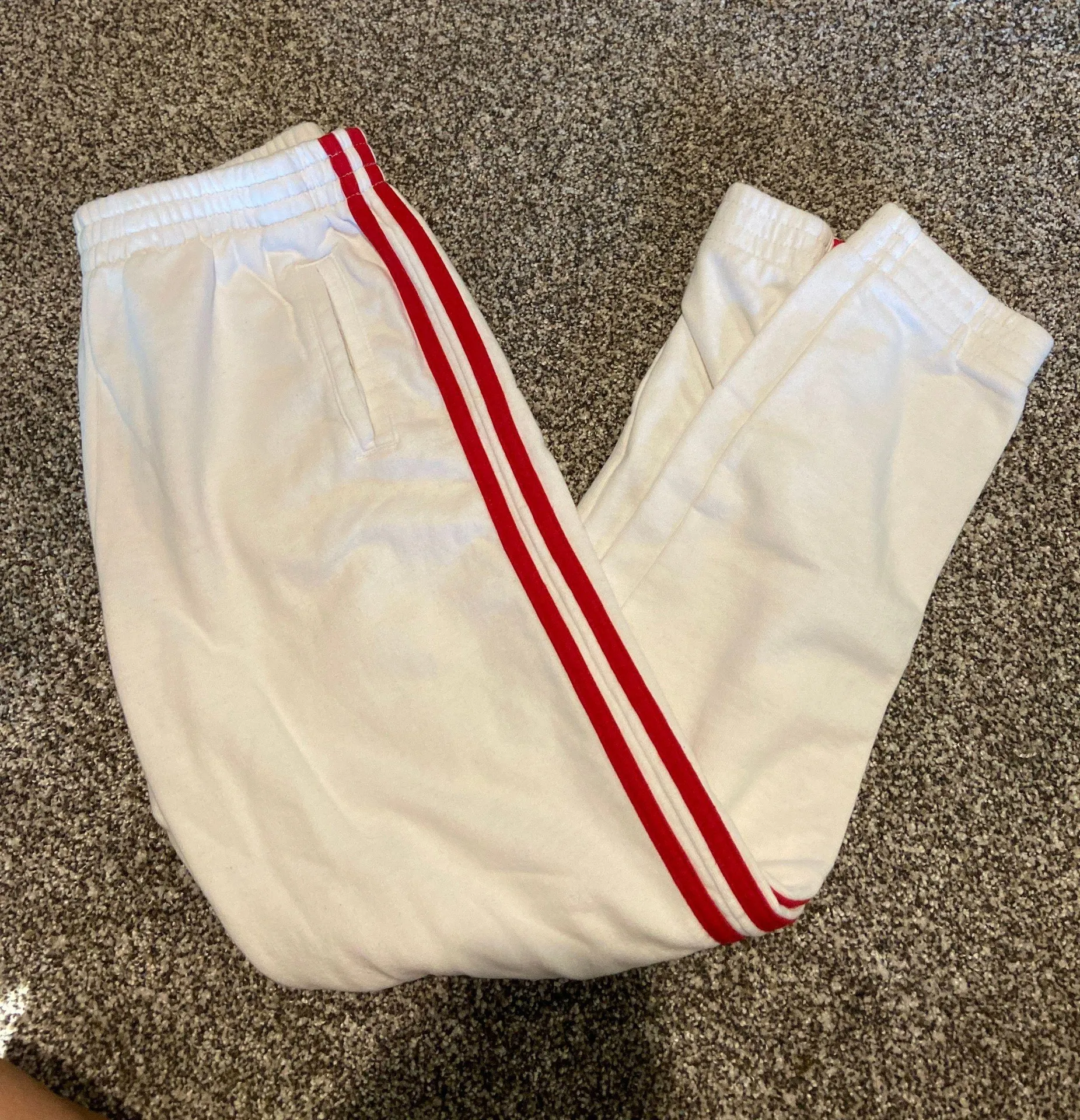 White and red Brandy sweatpants. They do have pockets. They’re one size fits all but I would say the... Show more