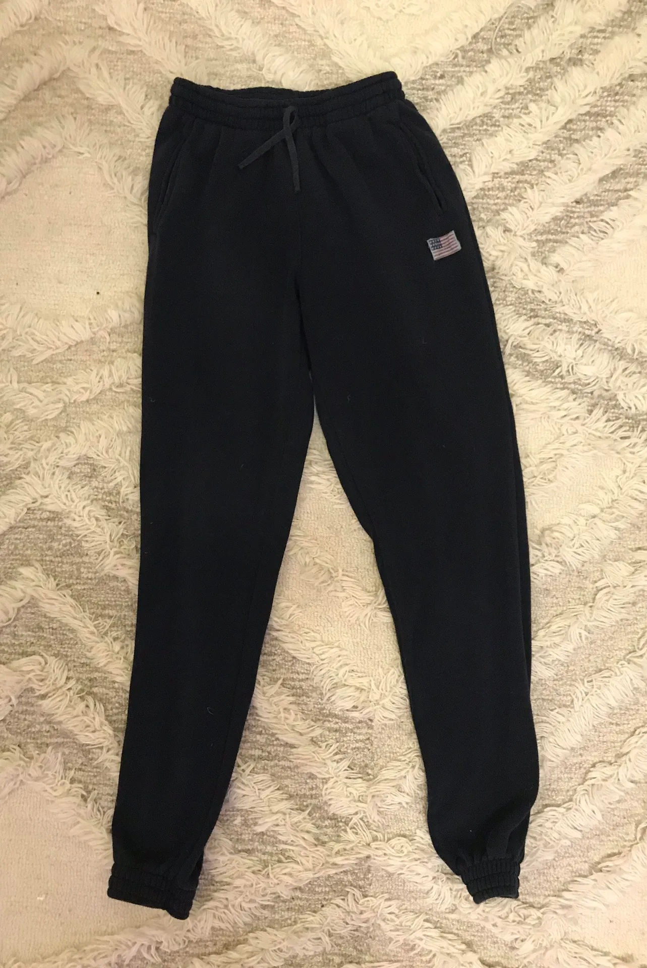 Navy blue with American flag sweats. Very pilled and I’m okay condition. There ARENT any rips. Reall... Show more