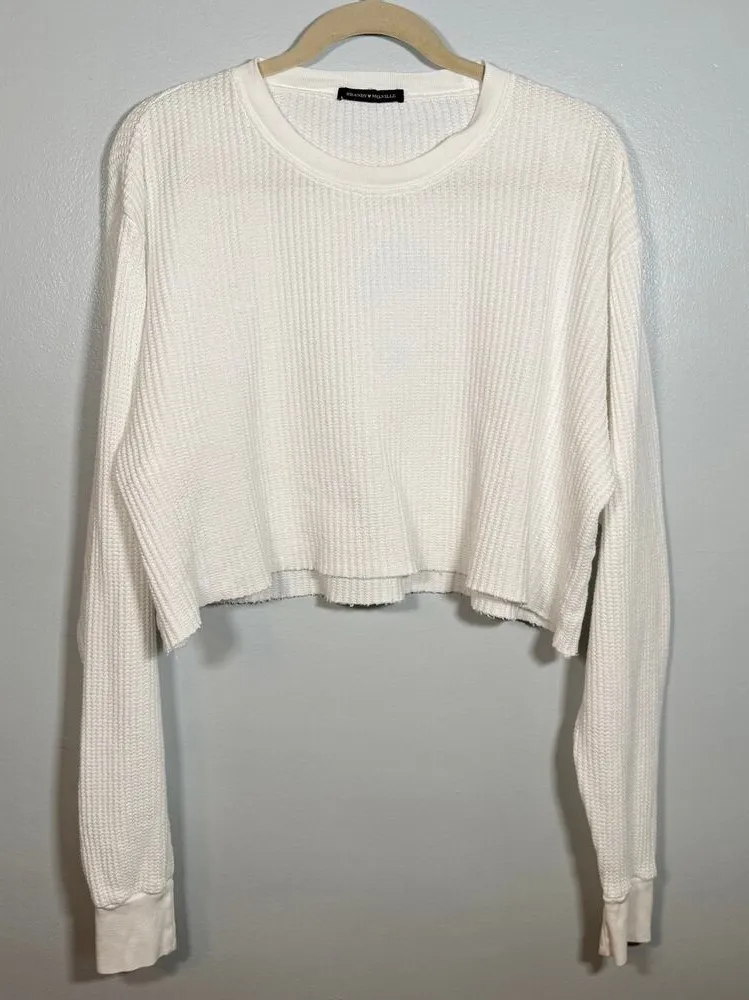 The perfect Y2K-inspired basic—Brandy Melville cropped waffle knit long sleeve in soft white. Made i... Show more