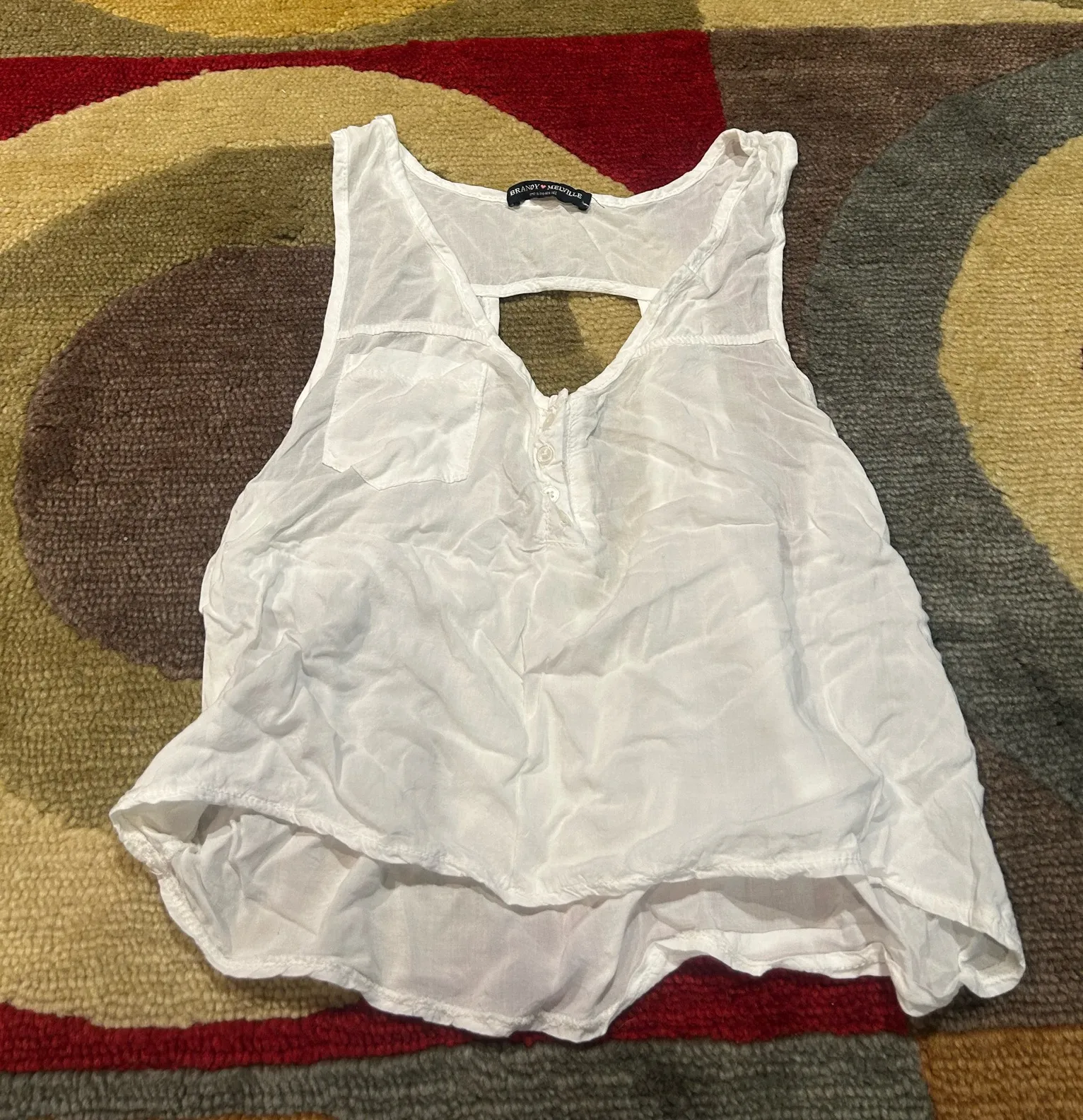 Brandy Melville White Sheer Blouse Tank Top /Crop Top Henley Back Cutout Pocket One Size Great C... Show more
