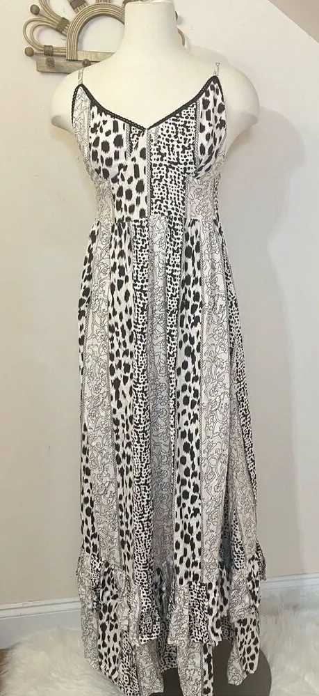 Fun and Funky maxi summer dress from Brass Monkey Lightweight, flowy, woven fabric with an eye-catching neutral mixed animal print 100% viscose Flattering fit-and-flare maxi dress silhouette Flattering v-neckline with so pretty lace trim Low back with an elastic smocked back panel Adjustable spaghetti straps Bottom ruffle tier detail Great condition, no flaws to note Q Vacation Summer Lightweight Resort Cruise