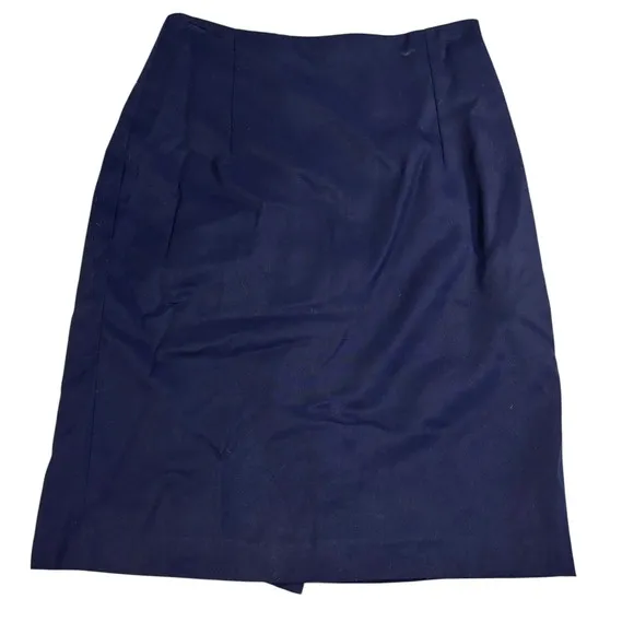 A classic career skirt from Brass Plum, sold at Nordstrom. This navy blue skirt features a straight, pencil silhouette, offering a timeless and professional look. It is fully lined for comfort and a smooth fit. The skirt includes a back zipper closure and a small decorative button detail on the back. A subtle slit at the hem allows for ease of movement. Measurements: * Waist: 14 inches * Length: 21 inches Type: Skirt Style: Straight & Pencil Skirt Length: Knee Length Color: Blue Department: Women Pattern: Solid Material: Polyester, Rayon, Polyester Blend Accents: Button, Zipper Fabric Type: Twill Features: Slit, Lined Character: Classic, Career Closure: Zip Occasion: Business, Workwear, Casual Keywords: Brass Plum, Nordstrom, Career Skirt, Pencil Skirt, Straight Skirt, Navy Blue Skirt, Lined Skirt, Womens Skirt, Size 6, Business Attire, Office Wear, Classic Skirt, Professional Skirt