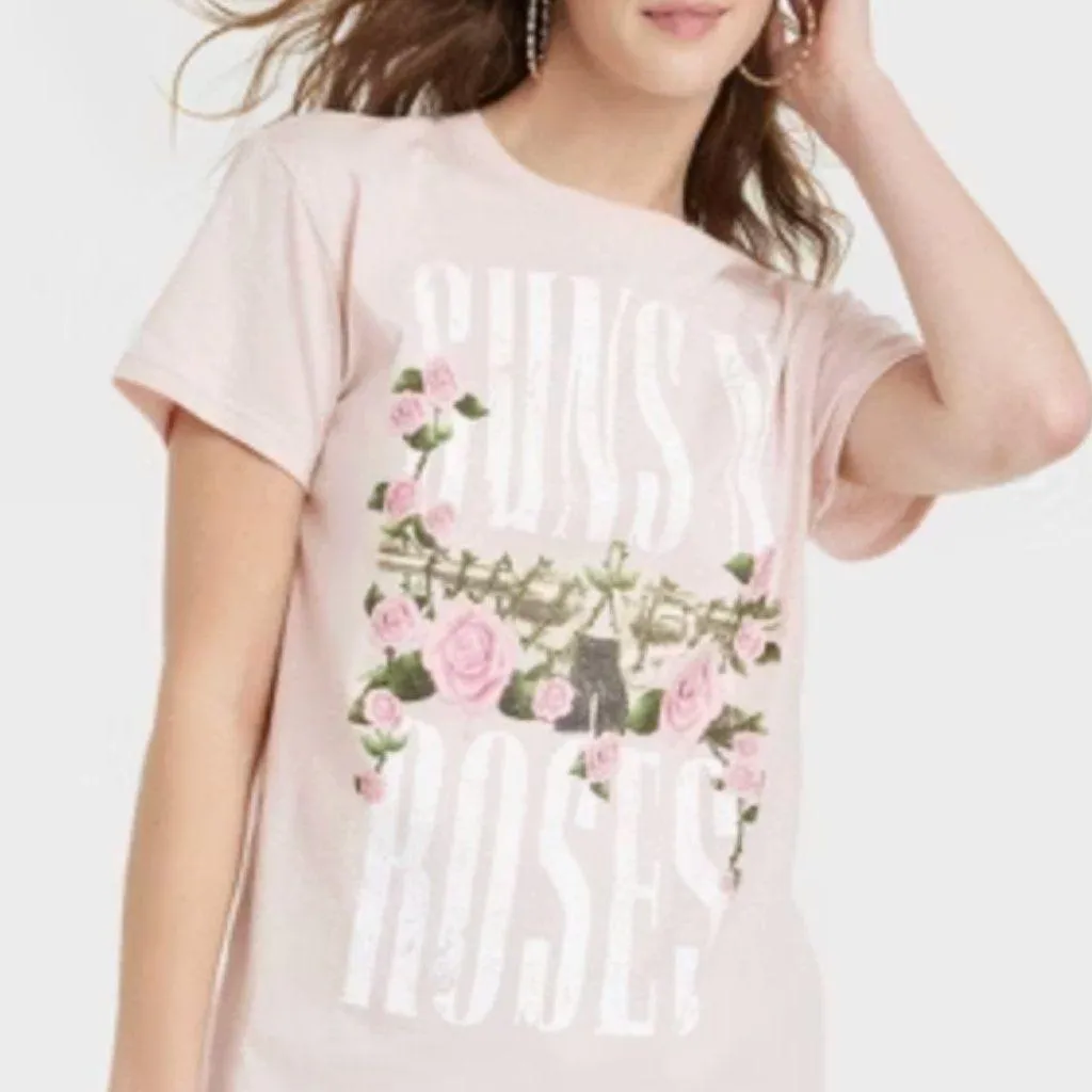 ◇ Guns N' Roses from Bravado ◇ Guns N Roses Floral Short Sleeve Graphic T-Shirt ◇ size small (may be juniors, unsure) ◇ band tee band t-shirt graphic tee graphic t-shirt ◇ blush pink ish and/or rose pink ish with white spellout "Guns N' Roses" graphic with pink and green roses flowers floral print ◇ raw hem unfinished hem and rolled hem / lightweight ◇ crew neck and short sleeve ◇ seems to be at least slightly cropped crop top length ◇ 100% cotton - machine wash/dry ◇ approx fair to good used condition overall - ALTERED - hand cropped / hand cut bottom hem - unfinished, with no bottom seam; pretty fuzzy/pilly (more so in/near underarms); marks/spots on back near bottom as shown (unsure what they are, haven't tried removing; others possible) ◇◇◇ STOCK PHOTO DOES NOT HAVE SAME (AT LEAST SLIGHTLY) CROPPED FIT AND ROLLED, RAW HEM THAT MINE HAS ◇◇◇ ◇◇◇ Hard color to photo, may vary at least slightly from my pics ◇◇◇ ◇ measurements (flat): (approx, may vary slightly) bust: 18 in (36") waist: 17.5 in (35") length: 20.5 - 21 in approx - may vary due to being hand cut 13,083 fr ◇ band tee band t-shirt music tee music t-shirt concert tee concert t-shirt rock music rock & roll rock and roll hard rock music festival preppy prep spring summer fall autumn casual every day school weekend errands travel vacay vacation girly fem feminine coquette soft girl softgirl teen teenager college student trendy on trend comfy cozy loungewear